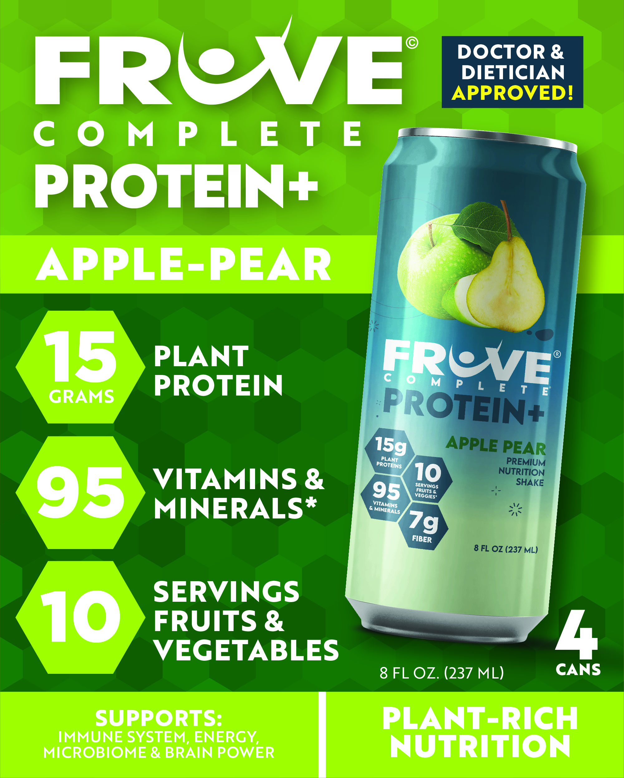 FrUve Complete Protein plant-based nutrition shake isn’t just another vanilla or chocolate drink, it’s a revolution in adult nutrition and for active agers. FrUve Complete Protein champions clean labels with real food ingredients. It’s Food as Medicine while raising the bar for adult nutrition. FrUve Complete Protein offers a delicious and convenient way to nourish your body with the essential building blocks it craves. Each 8oz serving boasts 15grams of pea protein for muscle health and satiety, 7grams of fat aiding sustainable energy, 21 vitamins at 70% DV for complete daily support, and 7grams of fiber for gut health and digestion. Studies in Public Library of Science show incorporating 5-15 daily fruit/veggie servings can add 3-13 years to your life (based on age & lifestyle). FrUve Complete Protein plant-based nutrition shake packs in the power of nine servings of fruits and vegetables (nutritional equivalent) in every delicious 8oz, putting you well on your way to achieving this recommended intake. It is nutrient dense. Fuel your active life, conquer busy schedules, or simply embrace a healthier you – FrUve Complete Protein empowers everyone. FrUve isn’t just a drink; it’s a movement towards a healthier, more vibrant future. We’re committed to providing adults with the tools they need to reach their full health potential. With its delicious taste, powerful blend of fruit, plant-based protein, essential nutrients, and clean label approach, FrUve is the perfect addition to your daily routine. Join the next-generation of adult nutrition, one delicious sip at a time. Drink FrUve.